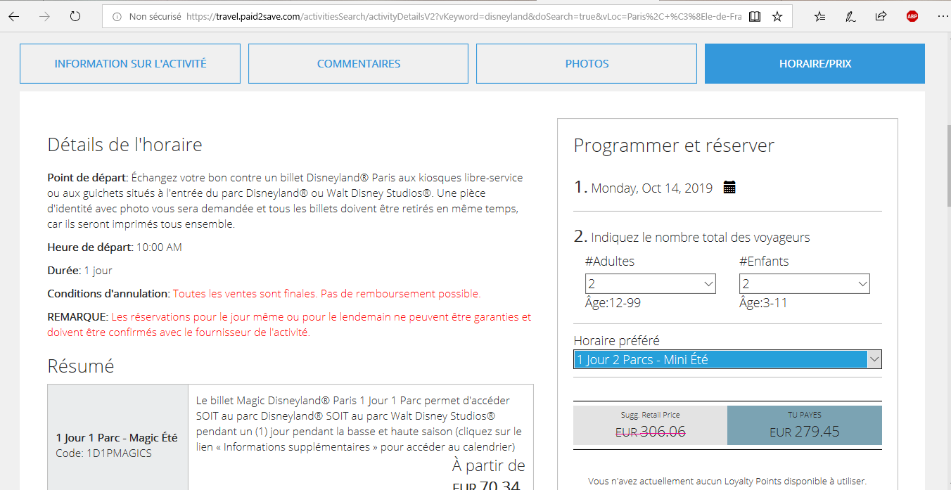 Comparatif Disney 1 jour 2 parcs 15.50 euros de différence avec le site officiel
